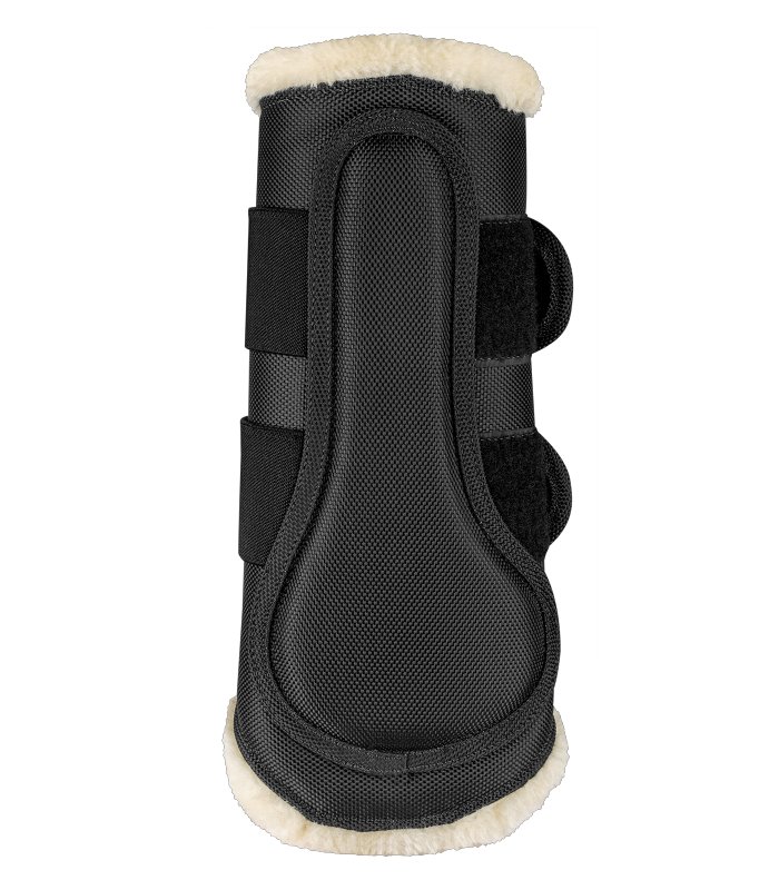Chrániče z odolného materiálu polstrované umělým beránkem. K použití pro přední i zadní nohy. Výborně sedí. Zapínání na suchý zip.