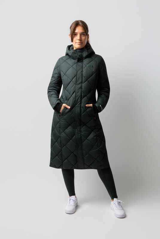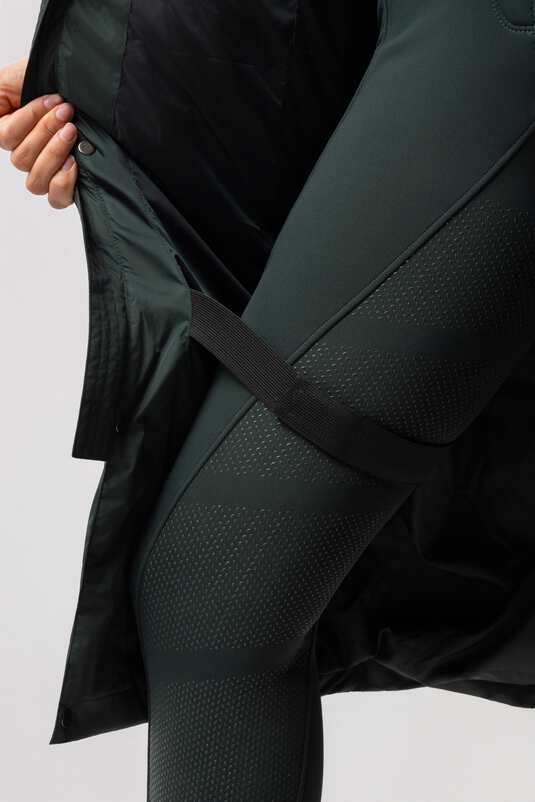Dlouhý, hřejivý prošívaný kabát s odnímatelnou kapucí. Uzpůsoben k ježdění, ma rozepínací zadní část a elastické pásky k zapnutí okolo stehen. Projmutý střih. Vodotěsnost 3000 mm, prodyšnost 3000 mvp. Lze prát v pračce na 30 stupňů, nesušit v sušičce.