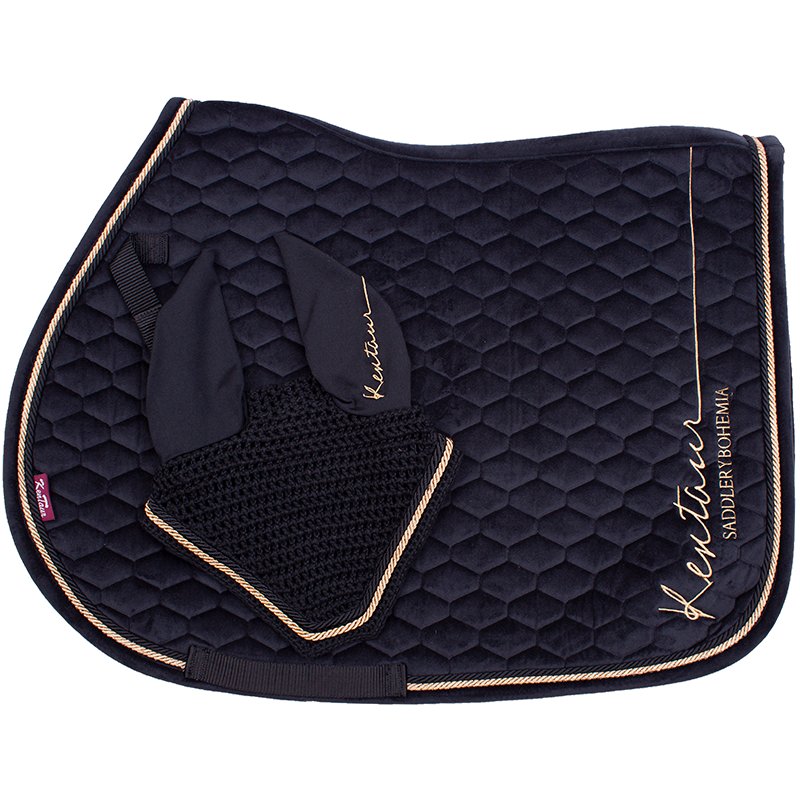 Sametová podsedlová dečka s novým vzorem prošívání v sadě s náušníky. Ozdobná kroucená šňůra a výšivka v barvě rosegold. Spodní strana z rychleschnoucí HI-TECH síťoviny.